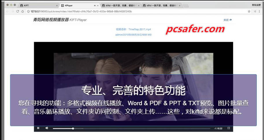 文件夹访问级别控制、视频在线影院、Word/PPT/TXT/PDF文档在线预览、音乐在线欣赏、图片库在线预览...kiftd均一一具备,每一份kiftd均是“完全版”。