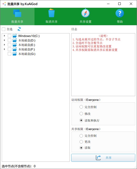 可以一键共享文件夹,更牛逼的是可以批量设置共享并编辑共享和安全权限。 经常会共享多个文件夹,最先使用的是批处理,但不是很方便,后来自学编程后把相关功能给桌面化实现了。 下面是软件简介: 1. 软件使用QT编写,Enigma压缩。使用了Windows相关共享API。 2. 动态加载磁盘目录,节省资源和时间,共享操作使用了线程池,以最快时间完成所有操作。 3. 勾选需要设置共享的文件夹,并设置相应的共享和安全权限,一键完成批量设置。 4. 一键取消所有共享。 5. 共享文件后不能正常访问?可能是系统相关策略有影响,一键…